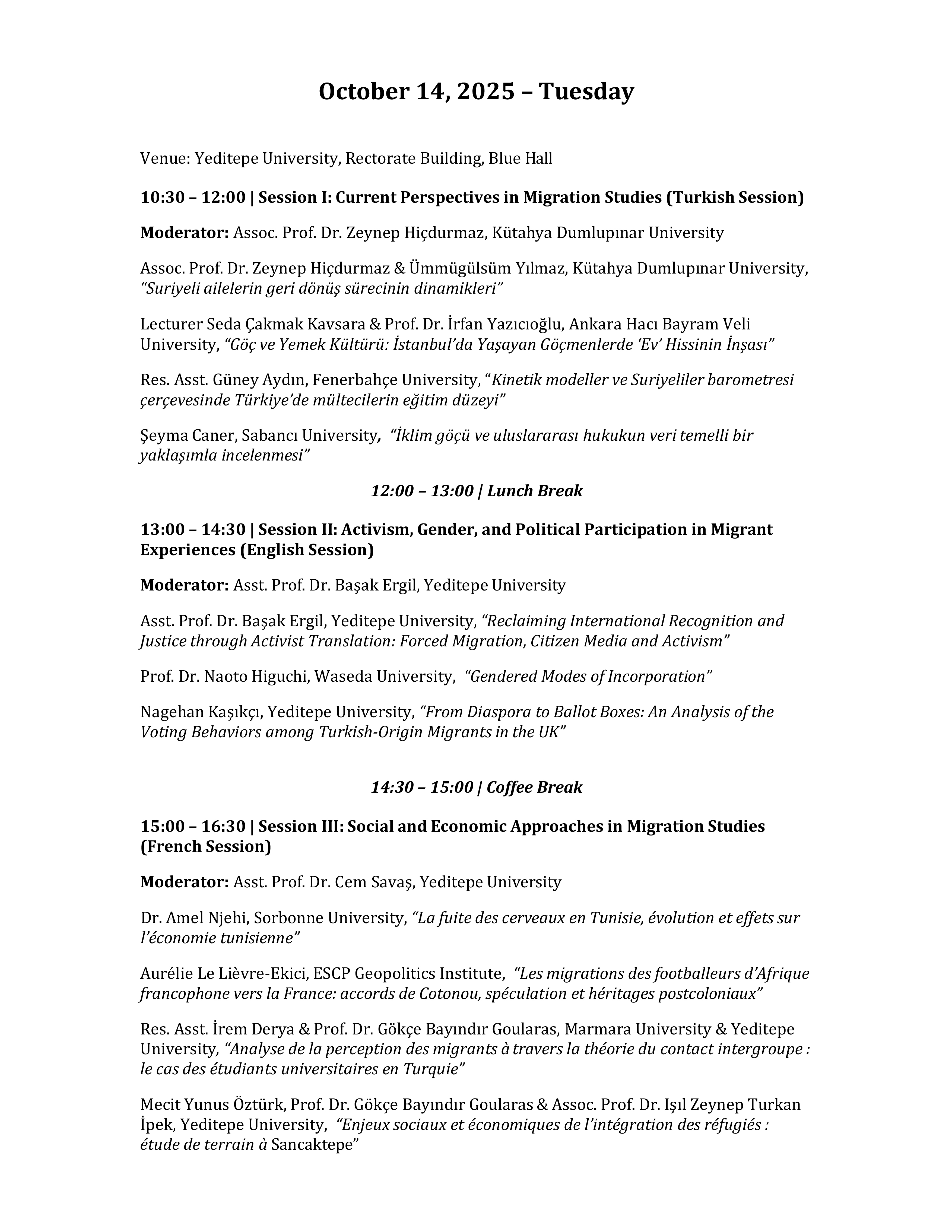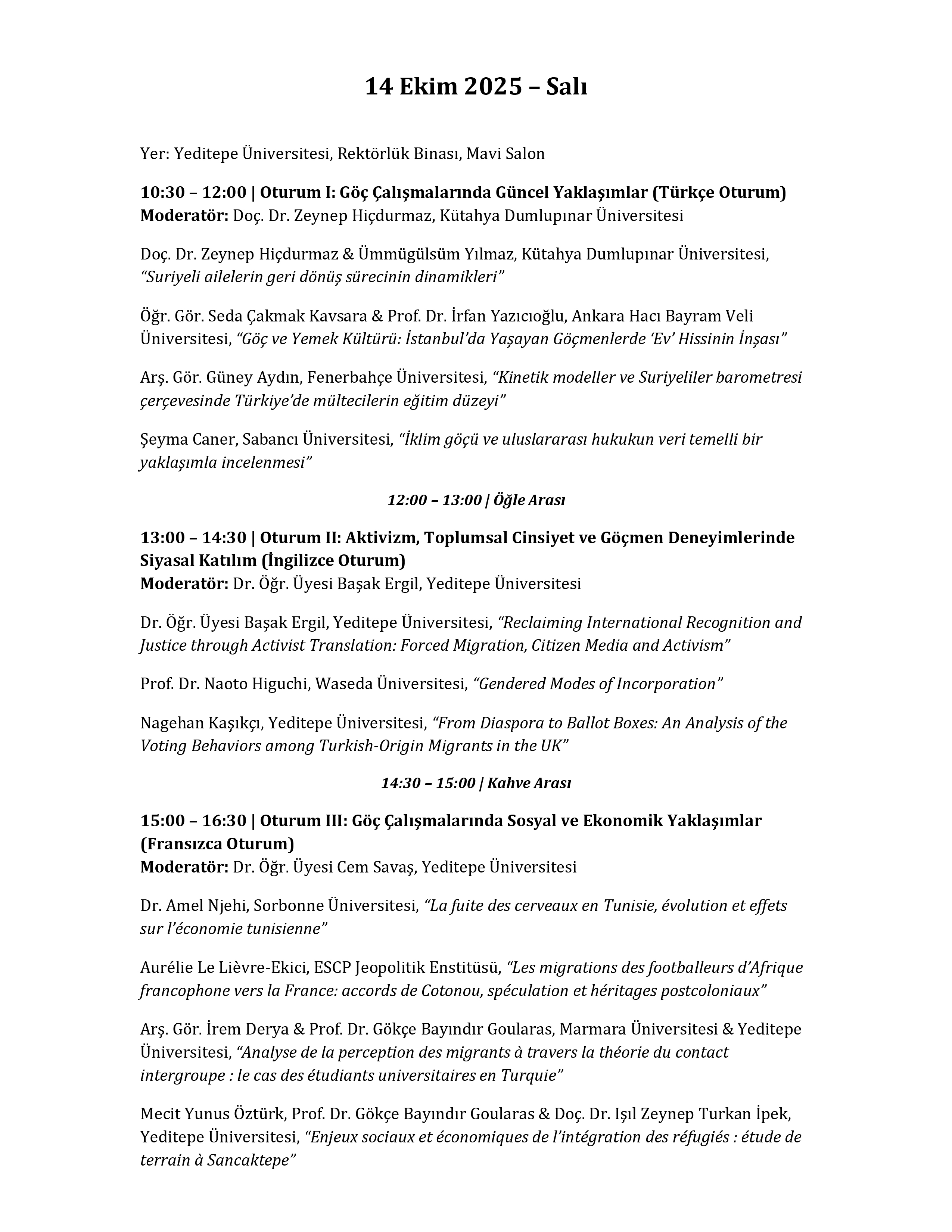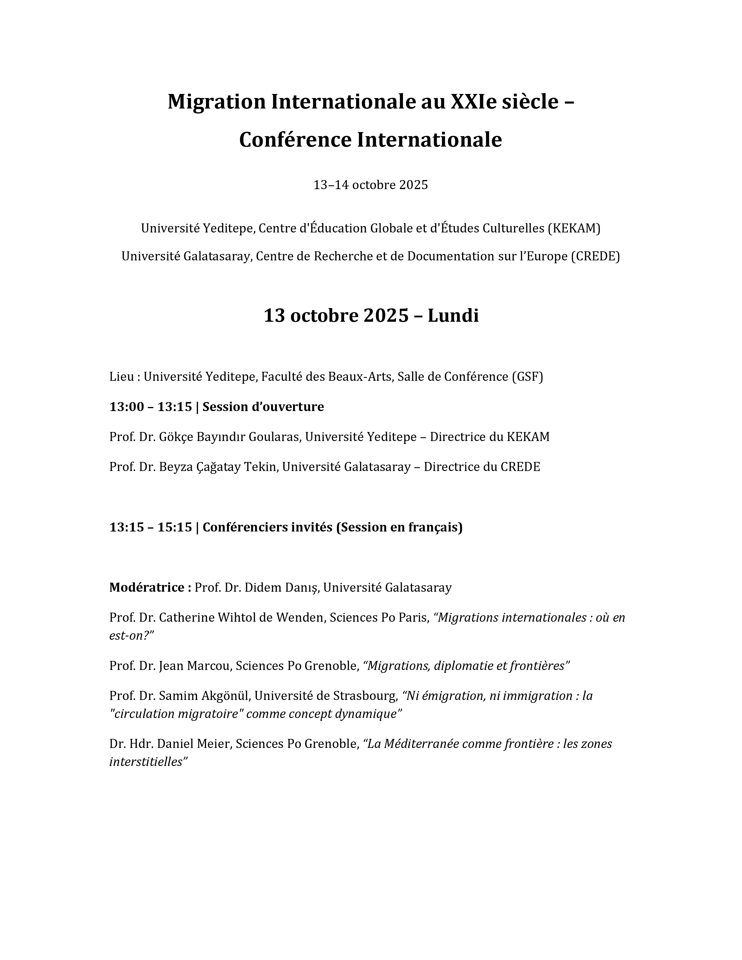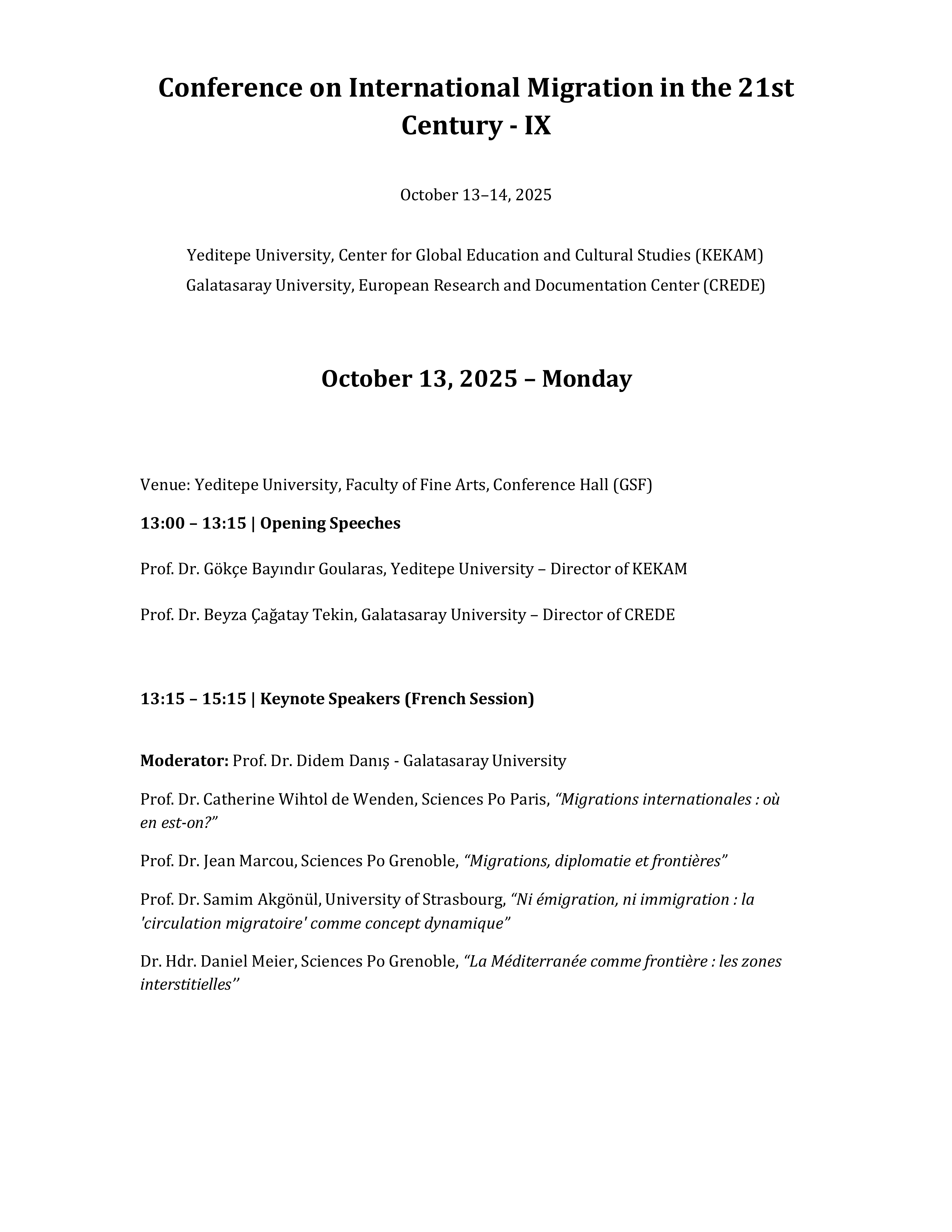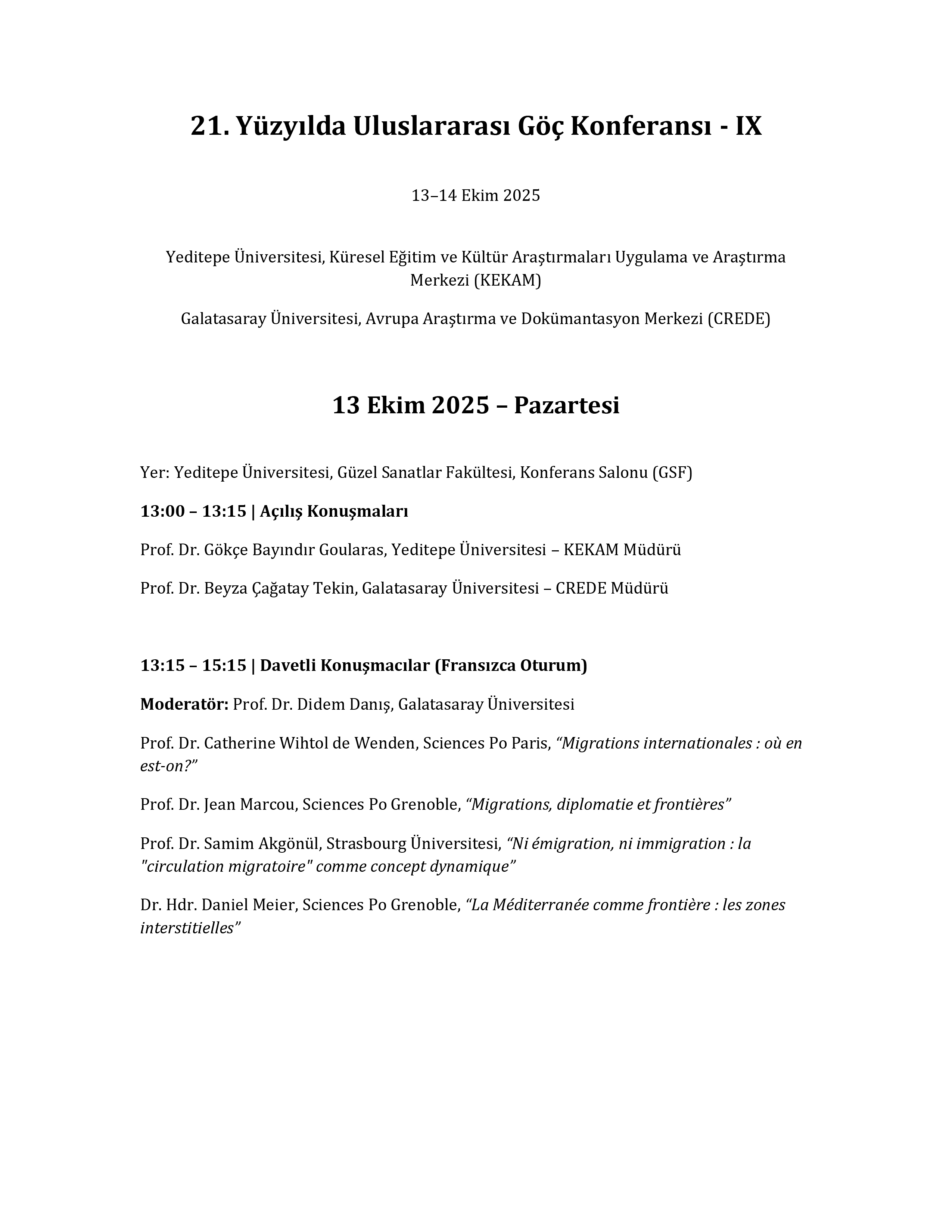 13-14 Ekim 2025 tarihlerinde Galatasaray Üniversitesi Avrupa Araştırma ve Dokümantasyon Merkezi (CREDE) ile Yeditepe Üniversitesi Küresel Eğitim ve Kültür Araştırmaları Uygulama ve Araştırma Merkezi (KEKAM) işbirliğinde “21. Yüzyılda Uluslararası Göç Konferansı” düzenlenecektir. Yeditepe Üniversitesi’nin ev sahipliğinde düzenlenecek olan konferans, uluslararası göç hareketlerinin siyasi, iktisadi, hukuki ve sosyolojik boyutlarını tarihsel bir bakış açısıyla ele almayı amaçlamaktadır.